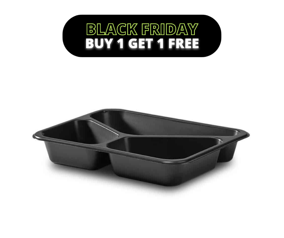 955ml Rectangular Black Top Seal PP Trays – 3 Cavity